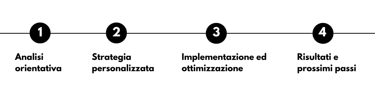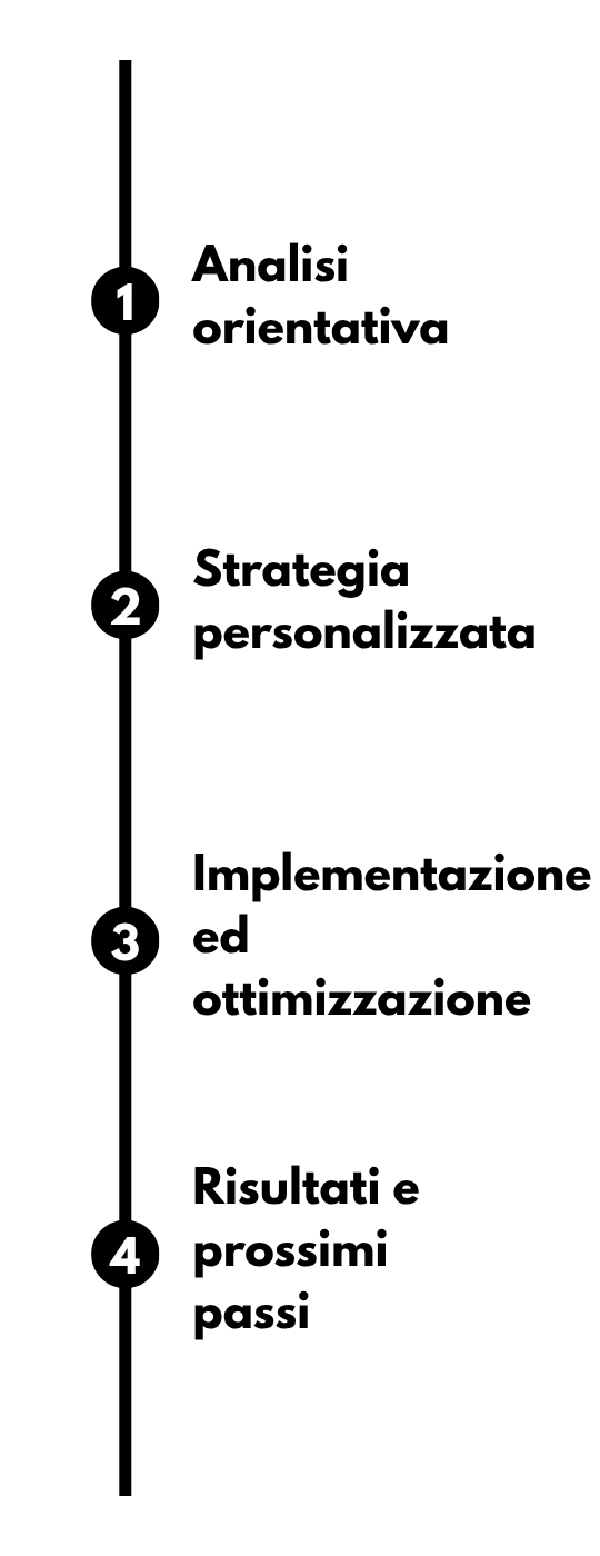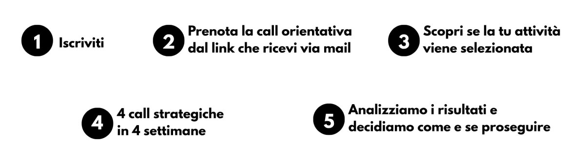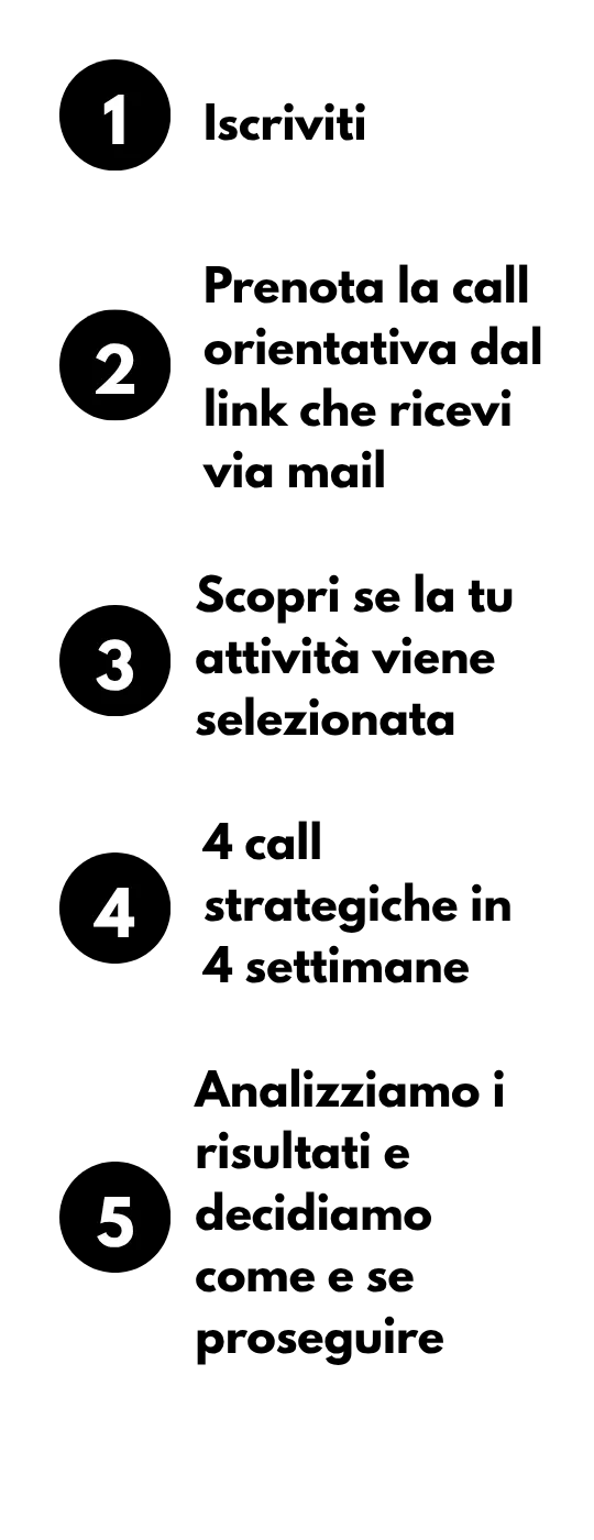 5. Conclusione e passi successivi: Alla fine del mese, avrai dati e risultati su cui riflettere. Decideremo insieme il da farsi: potrai scegliere di continuare a lavorare con me (se vorrai, con un percorso più avanzato) oppure fare tesoro di quanto appreso e proseguire in autonomia. In ogni caso, non avrai alcun vincolo o obbligo di acquisto: la decisione sarà totalmente tua.